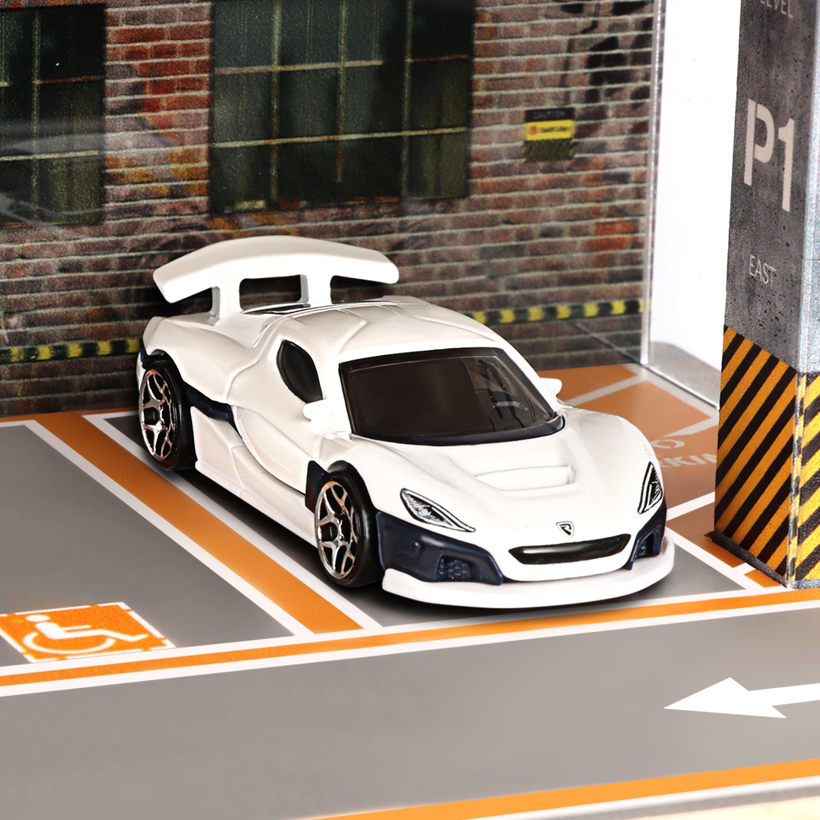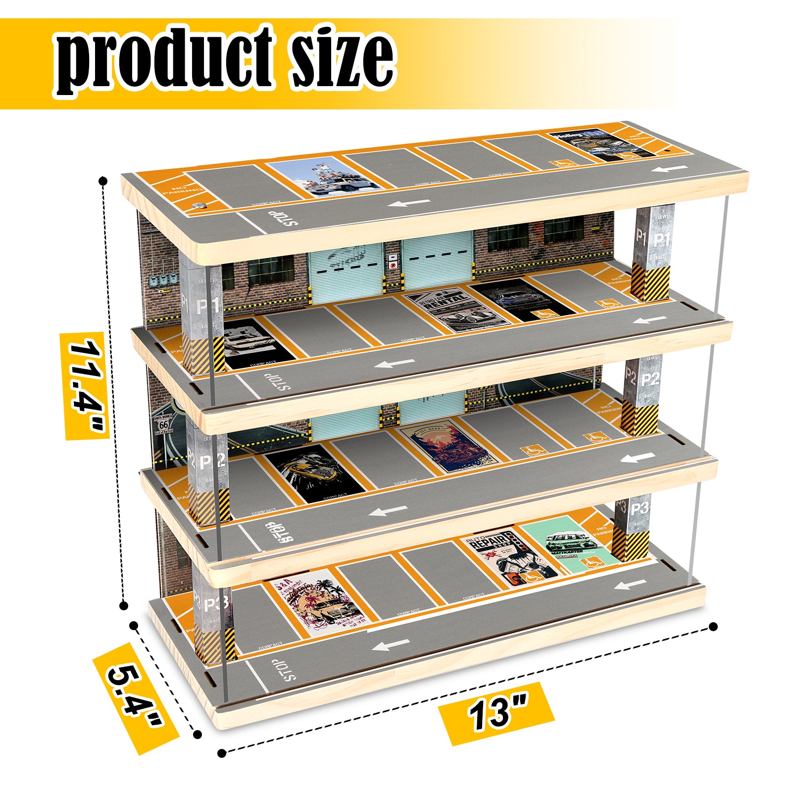 Exhibit your collection of 1:64 scale diecast cars with this premium Hot Wheels Parking Garage Diorama. Designed with built-in LED lights on each level, it ensures that your cars are always beautifully illuminated. The display case is equipped with transparent acrylic panels, providing excellent dust protection while keeping your cars visible. The entire unit features a sleek light-yellow color scheme with racing-themed elements, including custom-designed racing decals and designated disabled parking spots for an added touch of realism. With 4 sturdy wooden levels and space for 40 cars, this garage offers ample storage and display potential. Built from solid, durable wood, it is easy to assemble in under 20 minutes, making it the perfect addition to any toy car enthusiast’s collection.