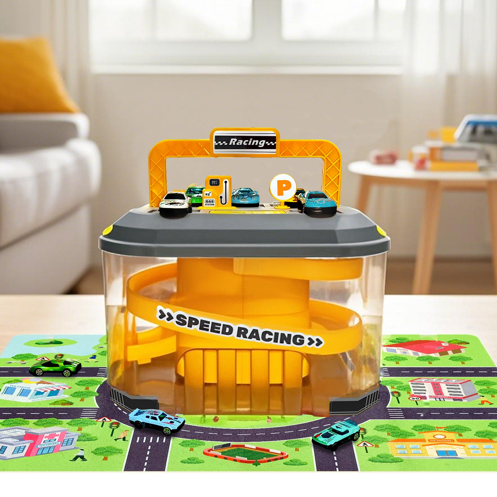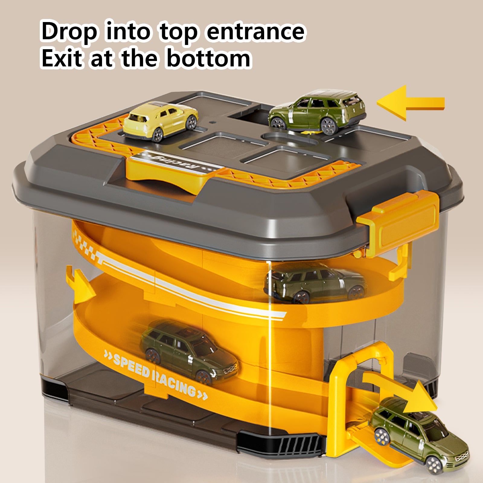 The ultimate toy car track storage playset has arrived! This all-in-one storage car track set gives kids everything they need for hours of imaginative play. The sturdy plastic bucket hides a built-in rotating spiral track – perfect for thrilling car chases. Simply drop the included 12 bright 1:64 die-cast cars into the top, and watch them zip around the spiral ramp and zoom out the bottom. Combine this with the 24-piece flexible track and vibrant city traffic play mat, and you’ve created a mini city where little drivers can race anywhere they want. Kids will love designing their own racetracks and cityscapes. Lay out the non-woven play mat (roads, intersections, buildings, and traffic lights) and connect the flexible track pieces. This realistic city scene encourages storytelling and role-play as children explore make-believe street scenes. The hands-on play supports fine motor skills, hand-eye coordination, and even early STEM concepts in a fun way. Cleanup and storage are just as easy. Attach the snap-on lids to close both ends of the bucket, converting it into a handy car storage case. With the spiral track in place, it stores about 20 cars; remove the track to expand capacity to around 50 cars. When playtime’s over, carry the set anywhere by the built-in handle – perfect for playdates or travel. No more stray cars cluttering the room, and everything packs up neatly into one place. Built with durable, child-safe materials, this versatile set is designed for hours of worry-free play. Easy, tool-free assembly gets kids racing in seconds. Best of all, it comes as a complete, gift-ready package. Parents will appreciate that all accessories are included, and car-obsessed kids will thrill at the instant entertainment. It’s the ideal birthday or holiday gift that delivers smiles and creative play for years to come, whether indoors or on-the-go.